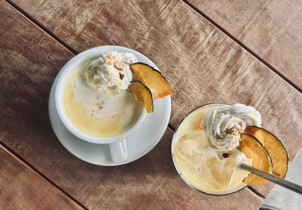 旬を味わうデザートや、優しい甘味のかぼちゃドリンクで、秋の味覚を楽しめます。窓が開いているので、ひんやりとした秋風がふわりと入り込み、心までリラックスします。